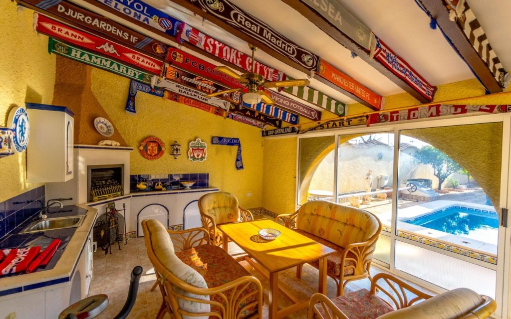 For sale villa with private pool Ciudad Quesada, Alicante Se sale detached villa in a central yet quiet area of Ciudad Quesada. This is a sunny home with plenty of space both inside and out. 3 bedrooms (the third is connected to the roof terrace – perfect for guests!)2 bathroomsSpacious and bright living roomFully equipped kitchenSeparate laundry room/storageExternal staircase leading to the roof terraceEnclosed terrace that serves as an additional living room/lounge The property offers a wonderful combination of privacy and comfort, with well-maintained outdoor spaces and cozy areas for both relaxation and social gatherings. There is plenty of space here: Large plot of 525 m² with fruit trees and a cozy barbecue areaPrivate pool measuring 4 x 8 metersSouth-facing orientation – plenty of sun all dayRoof terrace with views of the beautiful lagoonEnclosed outdoor lounge area with barbecue and dining space – ideal for social evenings all year round